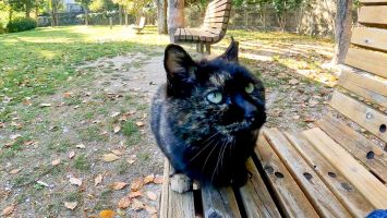 山奥の休憩所にいる黒猫ちゃんはここで休む人を癒やしてくれます