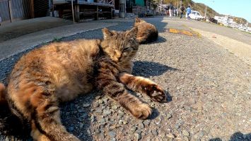 道路に堂々と寝転ぶ猫島の猫達がカワイイ【感動猫動画】
