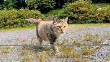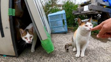 物置の前で寝ていた黒猫ちゃんを呼び寄せようとすると奥にいたキジトラ猫が寄ってきた
