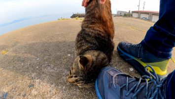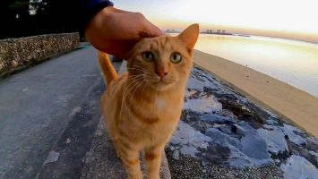 海辺で見掛けた茶トラ猫ちゃん、防波堤に座ると隣に座ってきてカワイイ