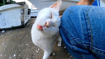 漁港の舟の下に白猫がいたのでナデナデすると擦り寄ってきてカワイイ【感動猫動画】