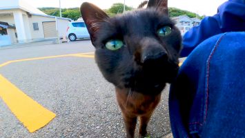 夕方の漁港で黒猫がモフられに来た【感動猫動画】