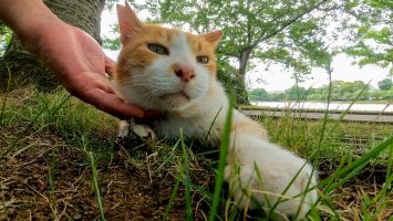 芝生の広場に野良猫がいたのでナデナデしてきた【感動猫動画】