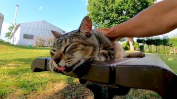 公園の芝生で野良猫を撫でると喜んでベンチまで付いてきた【感動猫動画】