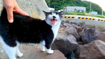 テトラポットの下にいたハチワレ猫を撫でると返事をしてきてカワイイ【感動猫動画】