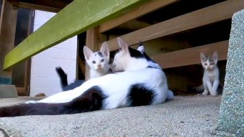 建物の日陰で休むハチワレ猫を撫でると茶トラ猫クンもやって来た【感動猫動画】