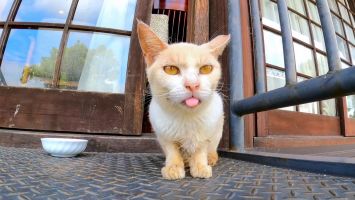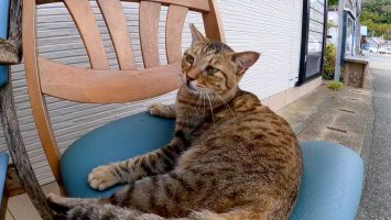 港前の通りに置いてある普通の椅子に座る猫をナデナデする【感動猫動画】