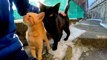 狭い路地の階段上に黒猫がいたのでナデナデすると強烈に甘えてくる茶トラ猫もやって来た【感動猫動画】