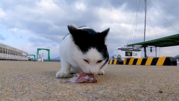 港で魚を食べていた白黒猫、後からきた茶トラ猫に魚を奪われる【感動猫動画】
