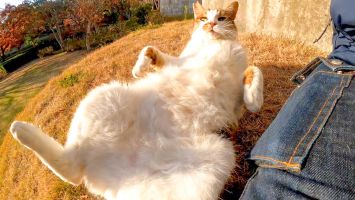 夕暮れの公園、芝生の広場にいた猫を隣に座って撫でる【感動猫動画】