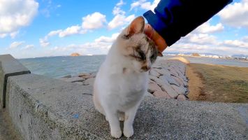 暴風の防波堤の上で何故か1人耐える猫をナデナデしてきた【感動猫動画】