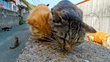 猫島の猫ちゃん達、防波堤でご飯です