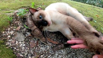 池の側のベンチに座ると三毛猫がやって来た【感動猫動画】