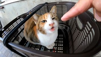 自転車の籠で寝ていた三毛猫をナデナデしたら降りてきて建物に入っていった
