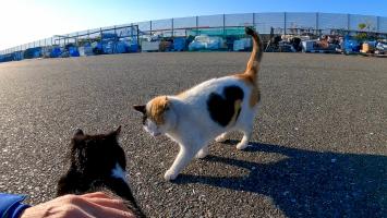 漁港の髭のハチワレ猫を撫でるとハートマークの三毛猫ちゃんも現れた【感動猫動画】