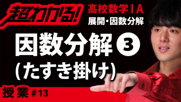因数分解❸たすき掛け(展開・因数分解)のポイントは! ✅ 2次の項の係数に何かいる式の因数分解は、たすき掛けを利用できないか疑おう! ✅ たすき掛けの手順は、 ①2次の項と定数項を分解する! ②組み合わせを、斜めに掛ける! ③足したものが、1次の項と一致したら、組み合わせをカッコでくくる! 👇共通テスト数学で9割取るための『超わかる!共通テスト対策講座』はコチラ👇 ▶https://www.infotop.jp/click.php?aid=403908&iid=92975 👇24時間サポート付きskype数学個別指導をご希望の方はコチラ👇 ▶http://kouki-honda.jp/skype/ ✅【最強の勉強法】「超わかる!授業動画」効果的な活用術 ▶︎https://youtu.be/XLFSQae9qdE 💯『中学数学の全部』を一気に勉強したい方はコチラ ▶https://bit.ly/3xxKKzQ 💯『高校数学の全部』を一気に勉強したい方はコチラ ▶︎https://bit.ly/3rHCyfg 💯『高校化学の全部』を一気に勉強したい方はコチラ ▶https://bit.ly/3pjhI3e 💯『高校英語の英文法全部』を一気に勉強したい方はコチラ ▶https://bit.ly/3ly2RRu 🔥激論集「塗りつぶせ」のを初めからご覧になりたい方はコチラ🔥 ▶︎https://bit.ly/3GaM1jo 👇『展開・因数分解』を初めから学べる再生リスト👇 ▶https://bit.ly/3HW6QR0 🎥前の動画🎥 ✅因数分解❸たすき掛け ▶https://youtu.be/9tqZtNV7Wug 🎥次の動画🎥 ✅因数分解❹たすき掛け(応用) ▶https://youtu.be/-Dr5tB-aXCE ✅「因数分解❸たすき掛け(展開・因数分解)」が苦手すぎる! ✅「因数分解❸たすき掛け(展開・因数分解)」を一から丁寧に勉強したい! そんな、あなたのための「因数分解❸たすき掛け(展開・因数分解)」授業動画へようこそ!! このオンライン授業で学べば、あなたの「因数分解❸たすき掛け(展開・因数分解)」の学力は一気に強くなり、「因数分解❸たすき掛け(展開・因数分解)」に対するあなたのイメージはガラリと変わります! ✨未来のあなたはこうなっている!✨ ✅「因数分解❸たすき掛け(展開・因数分解)」の全体像がわかる! ✅「因数分解❸たすき掛け(展開・因数分解)」の苦手が克服される! ✅「因数分解❸たすき掛け(展開・因数分解)」の受験問題に自力でチャレンジできる! このオンライン授業では、超重要な公式や、基礎的な問題の解き方を丁寧に解説しています! リアルの授業では絶対に表現できない動画の魔法を体感すれば、教科書の内容や学校の授業が、わかる!デキる!ようになっているはず! ※動画やチャンネルへ頂いた素敵なコメントは、チャンネル内で紹介させて頂くことがございます! ⚡『超わかる!授業動画』とは⚡ 中高生向けのオンライン授業を完全無料配信している教育チャンネルです。 ✅休校中の全国の学校・塾でもご活用・お勧めいただいています。 ✅中高生用の学校進路に沿った網羅的な授業動画を配信しています。 ✅「東大・京大・東工大・一橋大・旧帝大・早慶・医学部合格者」を多数輩出しています。 ✅勉強が嫌いな人や、勉強が苦手な人に向けた、「圧倒的に丁寧・コンパクト」な動画が特徴です。 ✅大手予備校で800人以上の生徒を1:1で授業したプロ講師の「独創性」「情熱」溢れる最強の授業。 ✅ただ難関大学の合格者が出ているだけでなく、受験を通して人として成長したとたくさんの方からコメントやメールを頂いている、受験の枠を超えたチャンネル。 ✅外出できない生徒さんの自学自習に、今も全国でご活用いただいております。 👍数学・英語の成績が確実に上がる勉強法!(授業動画の使い方) 【数学】➡ https://youtu.be/wtajeuzN3dY 【英語】➡ https://youtu.be/EHtv83-s8ns 【キーワード】 たすき掛け,展開,因数分解,式の計算,高校1年生,高校数学,超わかる,授業動画,オンライン授業,映像授業 #たすき掛け #展開 #因数分解 #式の計算 #高校1年生