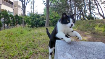 早朝の公園で人懐っこい片目の黒猫に出会った