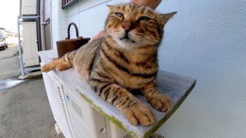 室外機の上で寝ていた猫をナデナデすると降りてきて擦り寄ってきた