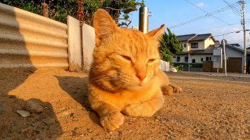 猫島の港付近で寝ていた猫、近くに行くと起きてモフられにきた