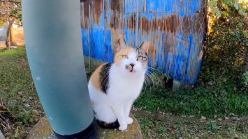 倉庫の裏にいた三毛猫を撫でるとゴロンゴロン転がってカワイイ