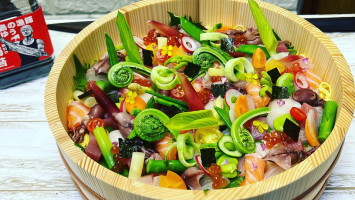 春の山菜を使用した海鮮ちらしの盛り方
