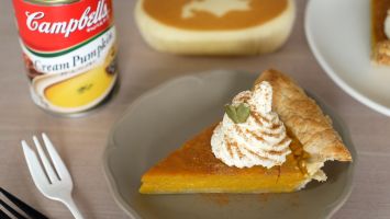 キャンベルスープ缶と北海道チーズ蒸しケーキを使って、混ぜるだけですぐできるパンプキンパイを作りました。これは食事なのか、はたまたデザートなのか?食事だと思って食べてると、トッピングの甘い生クリームが欲しくなり、食べているとひょっこりデザートが出てくる不思議なお味。食事とデザートの真ん中をいくパンプキンパイができました。 *レシピ*(21センチのタルト型 1台分) :材料: 無塩バター 適宜 強力粉 適宜 市販のパイシート(1枚あたり 10.5× 20.5cm 83g)3枚 卵黄 2個分 砂糖 40g キャンベルスープ クリームパンプキン 1缶 北海道チーズ蒸しケーキ 1個 生クリーム・シナモンパウダー・かぼちゃの種 適宜 :作り方: 1.タルト台に無塩バターを塗り、強力粉をふりかけ、余分な粉は落としておく。 2.市販のパイシート 3枚を使って、型より ひとまわり大きく伸ばす。くっつき防止に強力粉をふりかけながら作業するとよい。 3.(1)に(2)を敷き込む。 4.フォークなどで穴をあける。 5.余分なパイシートを切り落とし、整える。冷蔵庫で冷やしておく。 6.ボウルに卵黄 2個分、砂糖 40g、キャンベルスープのクリームパンプキン 1缶、北海道チーズ蒸しケーキ 1個を入れ、ハンドブレンダーで混ぜ合わせる。 7.(5)に(6)を流し込み、オーブンで40分焼成。240℃で予熱したオーブンを210℃にして15分→190℃にして10分→160℃にして15分焼く。途中、残り18分時点できれいな焼き色がついたので、ホイルをかぶせて焼きました。こうすることで、パイ中央の生焼けを防げます。 8.粗熱が取れたら、冷蔵庫で一晩冷やす。 9.できあがり。生クリーム、シナモンパウダー、かぼちゃの種を飾って召しあがれ。そういえばハロウィンですね。